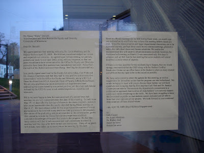 We appreciated our first meeting with you, Dr. Louis Mendoza, and Dr. Rickey Hall on April 22, 2009. We felt that you acknowledged our voices and respected our concerns. As agreed upon in that meeting, we publicly posted your reply to our open letter, along with our response, so that our peers would know how communicative the Office for Equity and Diversity proved to have been (this material was immediately removed—twice from the walls of the Barker and once from Rarig. See blog for documentation).