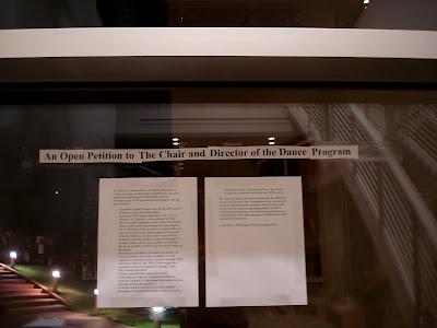 We have updates up to May 19, 2009 - at that point last year we no longer had the energy to continue a conversation with the University which had proven to be largely unproductive. However, as the Dance and University administration in general has not and will not fulfill the task of making their processes transparent and widely accessible, we must do it here. The upkeep of the standards of documentation and reportage as in keeping with our editorial policies will take some time. Please be patient. You may email us with any specific questions, concerns, or suggestions.